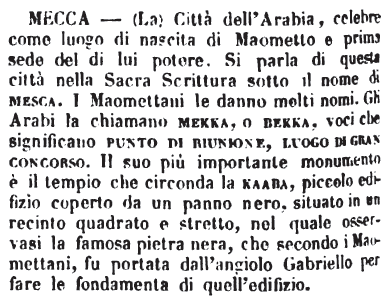 | Mecca (La) - Città dell'Arabia, celebre come luogo di nascita di Maometto e prima sede del di lui potere. Si parla di questa città nella Sacra Scrittura sotto il nome di mesca. I Maomettani le danno molti nomi. Gli Arabi la chiamano mekka, o bekka, voci che significano punto di riunione, luogo di gran concorso. Il suo più importante monumento è il tempio che circonda la kaaba, piccolo edificio coperto da un panno nero, situato in un recinto quadrato e stretto, nel quale osservasi la famosa pietra nera, che secondo i Maomettani, fu portata dall'angiolo Gabriello per fare le fondamenta di quell'edifizio. [immagine] |