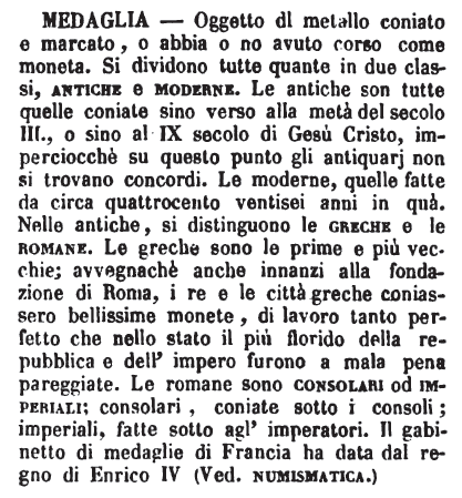 | Medaglia - Oggetto di metallo coniato e marcato, o abbia o no avuto corso come moneta. Si dividono tutte quante in due classi, antiche e moderne. Le antiche son tutte quelle coniate sino verso alla metà del secolo III., o sino al IX secolo di Gesù Cristo, imperciocchè su questo punto gli antiquarj non si trovano concordi. Le moderne, quelle fatte da circa quattrocento ventisei anni in quà. Nella antiche, si distinguono le greche e le romane. Le greche sono le prime e più vecchie; avvegnachè anche innanzi alla fondazione di Roma, i re e le città greche coniassero bellissime monete, di lavoro tanto perfetto che nello stato il più florido della repubblica e dell'impero furono a mala pena pareggiate. Le romane sono consolari od imperiali; consolari, coniate sotto i consoli; imperiali, fatte sotto agl'imperatori. Il gabinetto di medaglie di Francia ha data dal regno di Enrico IV (Ved. numismatica.) [immagine] |