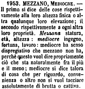 | Mezzano, Mediocre - Il primo si dice delle cose rispettivamente alla loro altezza fisica o altra qualunque loro elevazione; il secondo rispettivamente a ogni altra loro proprietà. Mezzana statura, età, altezza: mediocre ingegno, fortuna, lavoro: mediocre ha senso dispregiativo che mezzano non ha, perchè questo vuol dire propriamente ciò che sta naturalmente fra il più e il meno; mediocre si dice talora di cosa che per riguardo, convenienza o altro non si vuol tacciare assolutamente di brutta o cattiva. [immagine] |