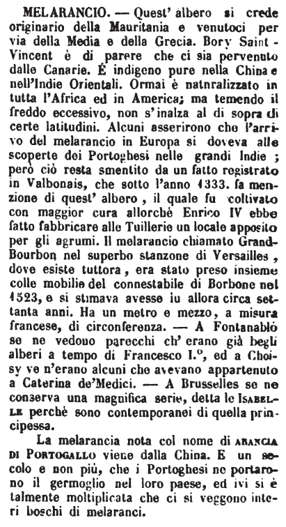 | Melarancio - Quest'albero si crede originario della Mauritania e venutoci per via della Media e della Grecia. Bory Saint-Vincent è di parere che ci sia pervenuto dalle Canarie. È indigeno pure nella China e nell'Indie Orientali. Ormai è naturalizzato in tutta l'Africa ed in America; ma temendo il freddo eccessivo, non s'inalza al di sopra di certe latitudini. Alcuni asserirono che l'arrivo del melarancio in Europa si doveva alle scoperte dei Portoghesi nelle grandi Indie; però ciò resta smentito da un fatto registrato in Valbonais, che sotto l'anno 1333. fa menzione di quest'albero, il quale fu coltivato con maggior cura allorché Enrico IV ebbe fatto fabbricare alle Tuillerie un locale apposito per gli agrumi. Il melarancio chiamato Grand-Bourbon nel superbo stanzone di Versailles, dove esiste tuttora, era stato preso insieme colle mobilie del connestabile di Borbone nel 1523, e si stimava avesse in allora circa settanta anni. Ha un metro e mezzo, a misura francese, di circonferenza. - A Fontanablò se ne vedono parecchi ch'erano già begli alberi a tempo di Francesco I.°, ed a Choisy ve n'erano alcuni che avevano appartenuto a Caterina de' Medici. - A Brusselles se ne conserva una magnifica serie, detta le Isabelle perché sono contemporanei di quella principessa.