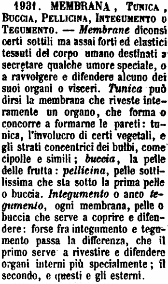 | Membrana, Tunica, Buccia, Pellicina, Integumento o Tegumento - Membrane diconsi certi sottili ma assai forti ed elastici tessuti del corpo umano destinati a secretare qualche umore speciale, o a ravvolgere e difendere alcuno dei suoi organi o visceri. Tunica può dirsi la membrana che riveste interamente un organo, che forma o concorre a formarne le pareti: tunica, l'involucro di certi vegetali, e gli strati concentrici dei bulbi, come cipolle e simili; buccia, la pelle delle frutta: pellicina, pelle sottilissima che sta sotto la prima pelle o buccia. Integumento o anco tegumento, ogni membrana, pelle o buccia che serve a coprire e difendere: forse fra integumento e tegumento passa la differenza, che il primo serve a rivestire e difendere organi interni più specialmente; il secondo, e questi e gli esterni. [immagine] |
