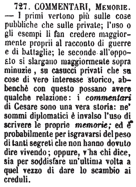 | Commentari, Memorie - I primi vertono più sulle cose pubbliche che sulle private; l'uso o gli esempi li fan credere maggiormente proprii al racconto di guerre e di battaglie; le seconde all'opposto si slargano maggiormente sopra minuzie, su casucci privati che su cose di vero interesse storico, abbenchè con questo possano avere qualche relazione: i commentari di Cesare sono una vera storia: ne' sommi diplomatici è invalso l'uso di scrivere le proprie memorie; ed è probabilmente per isgravarsi del peso di tanti segreti che non hanno dovuto dire vivendo; oppure, v'ha chi dice, sia per soddisfare un'ultima volta a quel vezzo di dare lo scambio ai creduli. [immagine] |