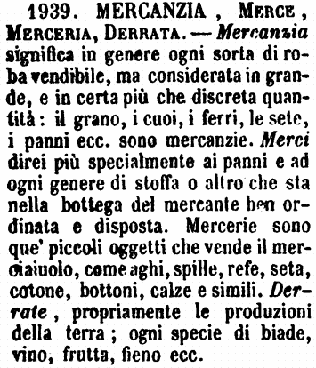 | Mercanzia, Merce, Merceria, Derrata - Mercanzia significa in genere ogni sorta di roba vendibile, ma considerata in grande, e in certa più che discreta quantità: il grano, i cuoi, i ferri, le sete, i panni ecc. sono mercanzie. Merci direi più specialmente ai panni e ad ogni genere di stoffa o altro che sta nella bottega del mercante ben ordinata e disposta. Mercerie sono que' piccoli oggetti che vende il merciaiuolo, come aghi, spille, refe, seta, cotone, bottoni, calze e simili. Derrate, propriamente le produzioni della terra; ogni specie di biade, vino, frutta, fieno ecc. [immagine] |