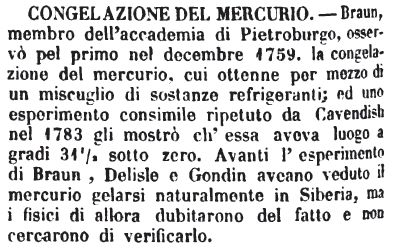 | Congelazione del mercurio - Braun, membro dell'accademia di Pietroburgo, osservò pel primo nel decembre 1759, la congelazione del mercurio, cui ottenne per mezzo di un miscuglio di sostanze refrigeranti; ed uno esperimento consimile ripetuto da Cavendish nel 1783 gli mostrò ch'essa aveva luogo a gradi 31½ sotto zero. Avanti l'esperimento di Braun, Delisle e Gondin aveano venuto il mercurio gelarsi naturalmente in Siberia, ma i fisici di allora dubitarono del fatto e non cercarono di verificarlo. [immagine] |