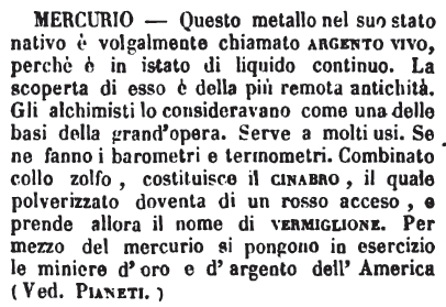 | Mercurio - Questo metallo nel suo stato nativo è volgalmente chiamato argento vivo, perchè è in istato di liquido continuo. La scoperta di esso è della più remota antichità. Gli alchimisti lo consideravano come una delle basi della grand'opera. Serve a molti usi. Se ne fanno i barometri e termometri. Combinato collo zolfo, costituisce il cinabro, il quale polverizzato doventa di un rosso acceso, e prende allora il nome di vermiglione. Per mezzo del mercurio si pongono in esercizio le miniere d'oro e d'argento dell'America (Ved. Pianeti.) [immagine] |