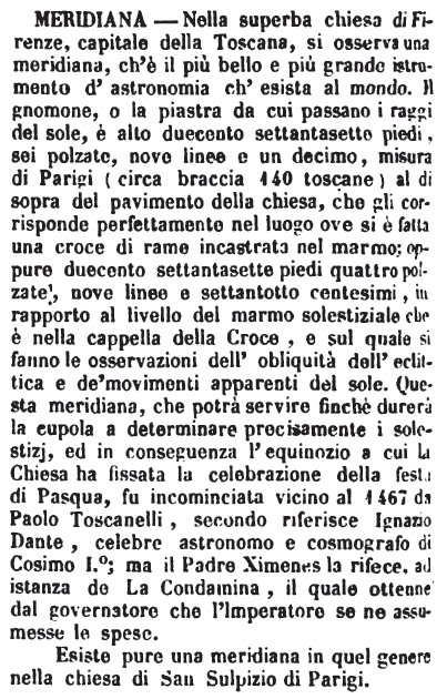 | Meridiana - Nella superba chiesa di Firenze, capitale della Toscana, si osserva una meridiana, ch'è il più bello e più grande istrumento d'astronomia ch'esista al mondo. Il gnomone, o la piastra da cui passano i raggi del sole, è alto duecento settantasette piedi, sei polzate, nove linee e un decimo, misura di Parigi (circa braccia 140 toscane) al di sopra del pavimento della chiesa, che gli corrisponde perfettamente nel luogo ove si è fatta una croce di rame incastrata nel marmo; oppure duecento settantasette piedi quattro polzate, nove linee e settantotto centesimi, in rapporto al livello del marmo solestiziale che è nella cappella della Croce, e sul quale si fanno le osservazioni dell'obliquità dell'eclittica e de' movimenti apparenti del sole. Questa meridiana, che potrà servire finchè durerà la cupola a determinare precisamente i solestizj, ed in conseguenza l'equinozio a cui la Chiesa ha fissata la celebrazione della festa di Pasqua, fu incominciata vicino al 1467 da Paolo Toscanelli, secondo riferisce Ignazio Dante, celebre astronomo e cosmografo di Cosimo I.°; ma il Padre Ximenes la rifece, ad istanza de La Condamina, il quale ottenne dal governatore che l'Imperatore se ne assumesse le spese.