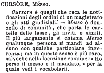 | Cursore, Messo - Cursore è quegli che reca le notificazioni degli ordini di un magistrato e gli atti giudiziali. - Messo è donzello di comunità, che porta le cartelle delle tasse, gli inviti e simili. E più largamente si chiama Messo qualunque persona si mandi ad alcuno con qualche particolare ingerenza; ma in questo senso è più raro, salvochè nella locuzione comune: «Ho perso il messo e il mandato,» per la quale vedi i vocabolarii. [immagine] |