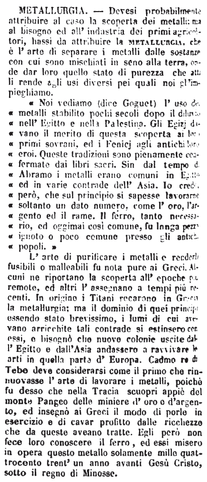 «Noi vediamo (dice Goguet) l'uso dei metalli stabilito pochi secoli dopo il diluvio nell'Egitto e nella Palestina. Gli Egizj davano il merito di questa scoperta ai loro primi sovrani, ed i Fenicj agli antichi loro eroi. Queste tradizioni sono pienamente confermate dai libri sacri. Sin dal tempo di Abramo i metalli erano comuni in Egitto ed in varie contrade dell'Asia. Io credo, però, che sul principio si sapesse lavorarne soltanto un dato numero, come l'oro, l'argento ed il rame. Il ferro, tanto necessario, ed oggimai cosi comune, fu lunga pezza ignoto o poco comune presso gli antichi popoli.» L' arte di purificare i metalli e renderli fusibili o malleabili fu nota pure ai Greci. Alcuni ne riportano la scoperta all'epoche più remote, ed altri l'assegnano a tempi più recenti. In origine i Titani recarono in Grecia la metallurgia; ma il dominio di quei principi essendo stato brevissimo, i lumi di cui avevano arricchite tali contrade si estinsero con essi, e bisognò che nuove colonie uscite dall'Egitto e dall'Asia andassero a ravvivare le arti in quella parte d'Europa. Cadmo re di Tebe deve considerarsi come il primo che rinnuovasse l'arte di lavorare i metalli, poiché fu desso che nella Tracia scuopri appiè del monte Pangeo delle miniere d'oro e d'argento, ed insegnò ai Greci il modo di porle in esercizio e di cavar profitto dalle ricchezze che da queste aveano tratte. Egli però non fece loro conoscere il ferro, ed essi misero in opera questo metallo solamente mille quattrocento trent'un anno avanti Gesù Cristo, sotto il regno di Minosse. [immagine] |