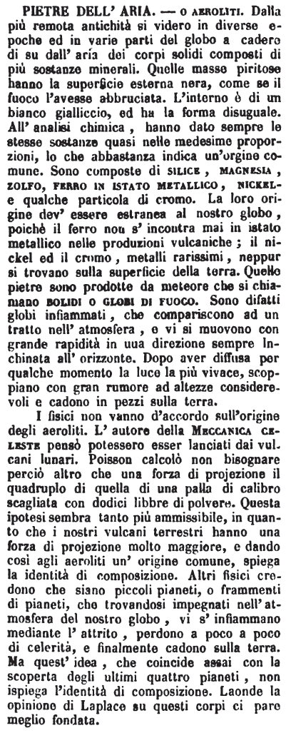 Pietre dell’aria - o aeroliti. Dalla più remota antichità si videro in diverse epoche ed in varie parti del globo a cadere di su dall'aria dei corpi solidi composti di più sostanze minerali. Quelle masse piritose hanno la superficie esterna nera, come se il fuoco l'avesse abbruciata. L'interno è di un bianco gialliccio, ed ha la forma disuguale. All'analisi chimica, hanno dato sempre le stesse sostanze quasi nelle medesime proporzioni, lo che abbastanza indica un'origine comune. Sono composte di silice, magnesia, zolfo, ferro in istato metallico, nickel e qualche particola di cromo. La loro origine dev'essere estranea al nostro globo, poiché il ferro non s'incontra mai in istato metallico nelle produzioni vulcaniche; il nickel ed il cromo, metalli rarissimi, neppur si trovano sulla superficie della terra. Quelle pietre sono prodotte da meteore che si chiamano bolidi o globi di fuoco. Sono difatti globi infiammati, che compariscono ad un tratto nell'atmosfera, e vi si muovono con grande rapidità in una direzione sempre inchinata all'orizzonte. Dopo aver diffusa per qualche momento la luce la più vivace, scoppiano con gran rumore ad altezze considerevoli e cadono in pezzi sulla terra.
