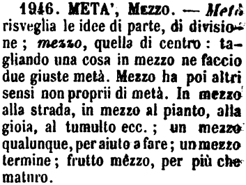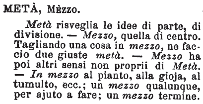 | Metà, Mezzo - Metà risveglia le idee di parte, di divisione; mezzo, quella di centro: tagliando una cosa in mezzo ne faccio due giuste metà. Mezzo ha poi altri sensi non proprii di metà. In mezzo alla strada, in mezzo al pianto, alla gioia, al tumulto ecc.; un mezzo qualunque, per aiuto a fare; un mezzo termine; frutto mezzo, per più che maturo. [immagine] |
