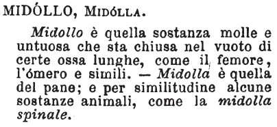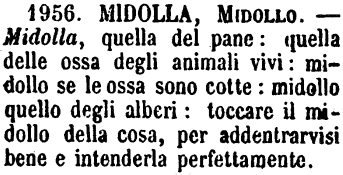 | Midolla, Midollo - Midolla, quella del pane: quella delle ossa degli animali vivi: midollo se le ossa sono cotte: midollo quello degli alberi: toccare il midollo della cosa, per addentrarvisi bene e intenderla perfettamente. [immagine] |