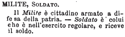 | Milite, Soldato - Il Milite è cittadino armato a difesa della patria. - Soldato è colui che è nell'esercito regolare, e riceve il soldo. [immagine] |