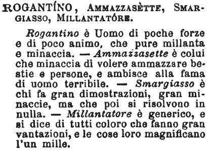| Rogantino, Ammazzasette, Smargiasso, Millantatore - Rogantino è Uomo di poche forze e di poco animo, che pure millanta e minaccia. - Ammazzasette è colui che minaccia di volere ammazzare bestie e persone, e ambisce alla fama di uomo terribile. - Smargiasso è chi fa gran dimostrazioni, gran minaccie, ma che poi si risolvono in nulla. - Millantatore è generico, e si dice di tutti coloro che fanno gran vantazioni, e le cose loro magnificano l'un mille. [immagine] |