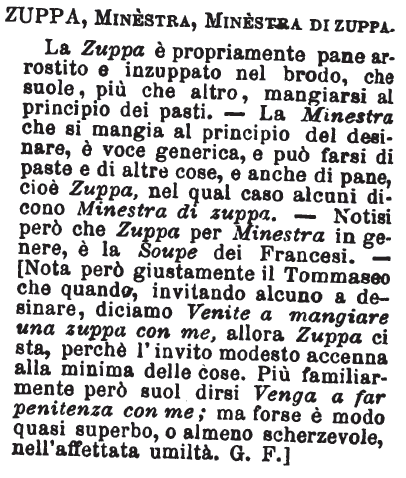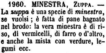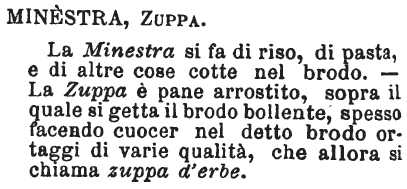 | Minestra, Zuppa - La zuppa è una specie di minestra, se vuolsi; è fatta di pane bagnato nel brodo: la vera minestra è di riso, di vermicelli, di farro o d'altro, e anche la mista con verdure, legumi ecc. [immagine] |
