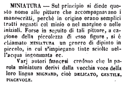 | Miniatura - Sul principio si diede questo nome alle pitture che accompagnavano i manoscritti, perchè in origine erano semplici tratti segnati col minio o nel margine o nelle iniziali. Forse in seguito di tali pitture, a cagione della piccolezza di esse figure, si è chiamato miniatura un genere di dipinto in piccolo, in cui s'impiegano tinte sciolte nell'acqua ingommata ec.