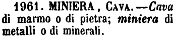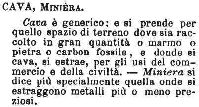 | Cava, Miniera - Cava è generico; e si prende per quello spazio di terreno dove sia raccolto in gran quantità o marmo o pietra o carbon fossile, e donde si cava, si estrae, per gli usi del commercio e della civiltà. - Miniera si dice più specialmente quella onde si estraggono metalli più o meno preziosi. [immagine] |