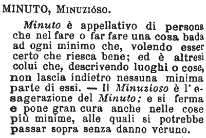 | Minuto, Minuzioso - Minuto è appellativo di persona che nel fare o far fare una cosa bada ad ogni minimo che, volendo esser certo che riesca bene; ed è altresì colui che, descrivendo luoghi o cose, non lascia indietro nessuna minima parte di essi. - Il Minuzioso è l'esagerazione del Minuto; e si ferma e pone gran cura anche nelle cose più minime, alle quali si potrebbe passar sopra senza danno veruno. [immagine] |