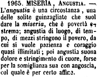| Miseria, Angustia - L'angustia è una circostanza, una delle solite guinzagliate che suol dare la miseria, che è povertà estrema; angustia di luogo, di tempo, di mezzi stringono il povero, da cui si vuole pazienza e coraggio quasi illimitati; poi angustia suona dolore e stringimento di cuore, forse per la somiglianza sua con angoscia, col quale è per certo affine. [immagine] |