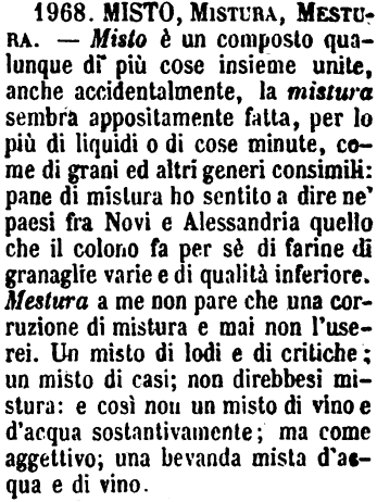 | Misto, Mistura, Mestura - Misto è un composto qualunque di più cose insieme unite, anche accidentalmente, la mistura sembra appositamente fatta, per lo più di liquidi o di cose minute, come di grani ed altri generi consimili: pane di mistura ho sentito dire ne' paesi fra Novi e Alessandria quello che il colono fa per sè di farine di granaglie varie e di qualità inferiore. Mestura a me non pare che una corruzione di mistura e mai non l'userei. Un misto di lodi e di critiche; un misto di casi; non direbbesi mistura: e così non un misto di vino e d'acqua sostantivamente; ma come aggettivo; una bevanda mista d'acqua e di vino. [immagine] |