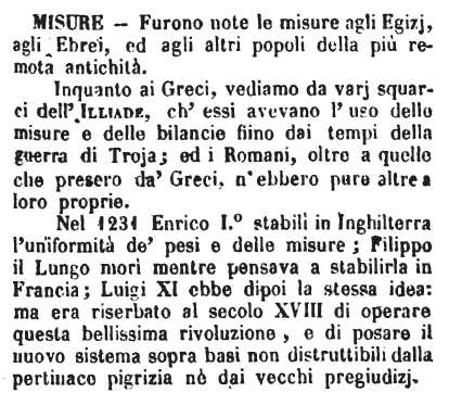 Nel 1231 Enrico I.° stabilì in Inghilterra l'uniformità de' pesi e delle misure; Filippo il Lungo morì mentre pensava a stabilirla in Francia; Luigi XI ebbe dipoi la stessa idea: ma era riserbato al secolo XVIII di operare questa bellissima rivoluzione, e di posare il nuovo sistema sopra basi non distruttibili dalla pertinace pigrizia nè da vecchi pregiudizj. [immagine] |