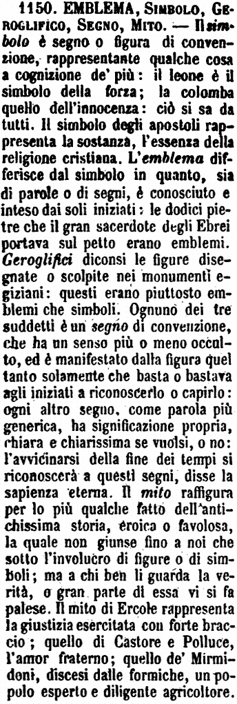 | Emblema, Simbolo, Geroglifico, Segno, Mito - Il simbolo è segno o figura di convenzione, rappresentante qualche cosa a cognizione de' più: il leone è il simbolo della forza; la colomba quello dell'innocenza: ciò si sa da tutti. Il simbolo degli apostoli rappresenta la sostanza, l'essenza della religione cristiana. L'emblema differisce dal simbolo in quanto, sia di parole o di segni, è conosciuto e inteso dai soli iniziati: le dodici pietre che il gran sacerdote degli Ebrei portava sul petto erano emblemi. Geroglifici diconsi le figure disegnate o scolpite nei monumenti egiziani: questi erano piuttosto emblemi che simboli. Ognuno dei tre suddetti è un segno di convenzione, che ha un senso più o meno occulto, ed è manifestato dalla figura quel tanto solamente che basta o bastava agli iniziati a riconoscerlo o capirlo: ogni altro segno, come parola più generica, ha significazione propria, chiara e chiarissima se vuolsi, o no: l'avvicinarsi della fine dei tempi si riconoscerà a questi segni, disse la sapienza eterna. Il mito raffigura per lo più qualche fatto dell'antichissima storia, eroica o favolosa, la quale non giunse fino a noi che sotto l'involucro di figure o di simboli; ma a chi ben li guarda la verità, o gran parte di essa vi si fa palese. Il mito di Ercole rappresenta la giustizia esercitata con forte braccio; quello di Castore e Polluce, l'amor fraterno; quello de' Mirmidoni, discesi dalle formiche, un popolo esperto e diligente agricoltore. [immagine] |