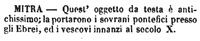 | Mitra - Quest'oggetto da testa è antichissimo; la portarono i sovrani pontefici presso gli Ebrei, ed i vescovi innanzi al secolo X. [immagine] |
