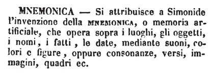 | Mnemonica - Si attribuisce a Simonide l'invenzione della Mnemonica, o memoria artificiale, che opera sopra i luoghi, gli oggetti, i nomi, i fatti, le date, mediante suoni, colori e figure, oppure consonanze, versi, immagini, quadri ec. [immagine] |