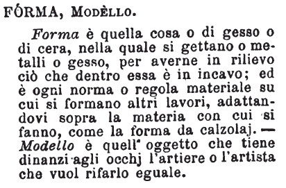 | Forma, Modello - Forma è quella cosa o di gesso o di cera, nella quale si gettano o metalli o gesso, per averne in rilievo ciò che dentro essa è in incavo; ed è ogni norma o regola materiale su cui si formano altri lavori, adattandovi sopra la materia con cui si fanno, come la forma da calzolaj. - Modello è quell'oggetto che tiene dinanzi agli occhj l'artiere o l'artista che vuol rifarlo eguale. [immagine] |