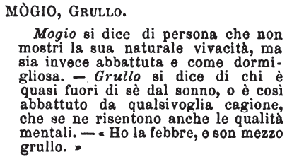 | Mogio, Grullo - Mogio si dice di persona che non mostri la sua naturale vivacità, ma sia invece abbattuta e come dormigliosa. - Grullo si dice di chi è quasi fuori di sè dal sonno, o è così abbattuto da qualsivoglia cagione, che se ne risentono anche le qualità mentali. - «Ho la febbre, e son mezzo grullo.» [immagine] |
