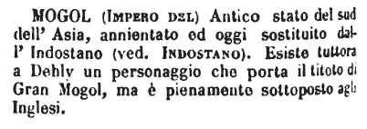 | Mogol (Impero del) - Antico stato del sud dell'Asia, annientato ed oggi sostituito dall'Indostano (ved. Indostano). Esiste tuttora a Dehly un personaggio che porta il titolo di Gran Mogol, ma è pienamente sottoposto agli Inglesi. [immagine] |