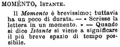 | Istante, Momento, Nell’istante, Nel momento - Istante, dice il Tommaseo, indica il punto del tempo.- Il Momento giunge e passa. - Nell'istante indica cosa fatta senza metter tempo in mezzo, che pur dicesi All'istante. - Nel momento può ammettere un qualche intervallo brevissimo. [immagine] |
