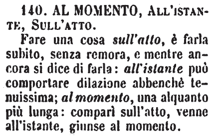 | Al momento, All’istante, Sull’atto - Fare una cosa sull'atto, è farla subito, senza remora, e mentre ancora si dice di farla: all'istante può comportare dilazione abbenchè tenuissima; al momento, una alquanto più lunga: comparì sull'atto, venne all'istante, giunse al momento. [immagine] |