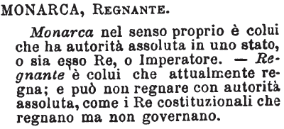 | Monarca, Regnante - Monarca nel senso proprio è colui che ha autorità assoluta in uno stato, o sia esso Re, o Imperatore. - Regnante è colui che attualmente regna; e può non regnare con autorità assoluta, come i Re costituzionali che regnano ma non governano. [immagine] |