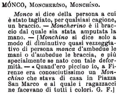 | Monco, Moncherino, Monchino - Monco si dice della persona a cui è stato tagliato, per qualsiasi cagione, un braccio. - Moncherino è il braccio dal quale sia stata amputata la mano. - [Monchino si dice solo a modo di diminutivo quasi vezzeggiativo di persona monca d’ambedue le mani o d’ambedue le braccia, e più specialmente se nato con tale deformità. - «Quand’ero piccino io, a Firenze era conosciutissimo un Monchino che stava di casa in Piazza San Marco e al quale i ragazzacci ne facevano di tutti i colori. G. F.] [immagine] |