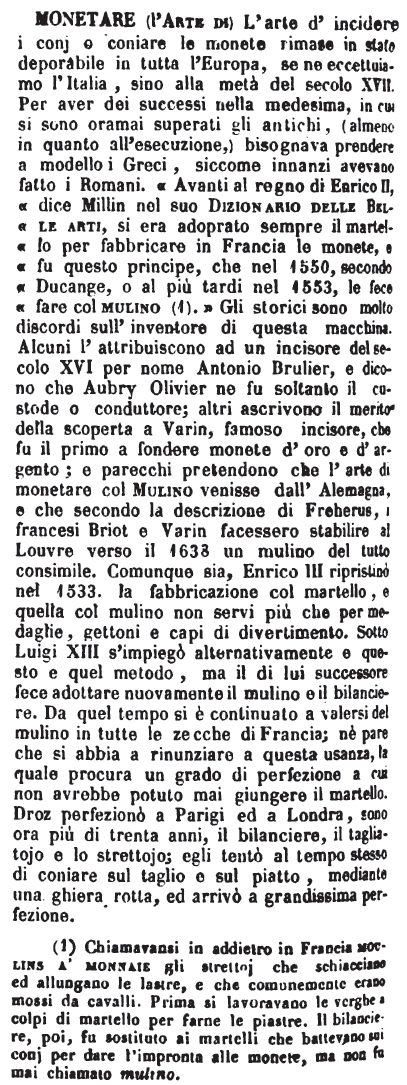 Monetare (L’arte di) - L'arte d'incidere i conj o coniare le monete rimase in stato deporabile in tutta l'Europa, se ne eccettuiamo l'Italia, sino alla metà del secolo XVII. Per aver dei successi nella medesima, in cui si sono oramai superati gli antichi,(almeno in quanto all'esecuzione,) bisognava prendere a modello i Greci, siccome innanzi avevano fatto i Romani. « Avanti al regno di Enrico II, dice Millin nel suo Dizionario delle Belle arti, si era adoprato sempre il martello per fabbricare in Francia le monete, e fu questo principe, che nel 1550, secondo Ducange, o al più tardi nel 1553, le fece fare col mulino (1).» Gli storici sono molto discordi sull'inventore di questa macchina. Alcuni l'attribuiscono ad un incisore del secolo XVI per nome Antonio Brulier, e dicono che Aubry Olivier ne fu soltanto il custode o conduttore; altri ascrivono il merito della scoperta a Varin, famoso incisore, che fu il primo a fondere monete d'oro e d'argento; e parecchi pretendono che l'arte di monetare col Mulino venisse dall'Alemagna, e che secondo la descrizione di Freherus, i francesi Briot e Varin facessero stabilire al Louvre verso il 1638 un mulino del tutto consimile. Comunque sia, Enrico III ripristinò nel 1533. la fabbricazione col martello, e quella col mulino non servi più che per medaglie, gettoni e capi di divertimento. Sotto luigi XIII s'impiegò alternativamente e questo e quel metodo, ma il di lui successore fece adottare nuovamente il mulino ed il bilanciere. Da quel tempo si è continuato a valersi del mulino in tutte le zecche di Francia; nè pare che si abbia a rinunziare a questa usanza, la quale procura un grado di perfezione a cui non avrebbe potuto mai giungere il martello. Droz perfezionò a Parigi ed a Londra, sono ora più di trenta anni, il bilanciere, il tagliatojo e lo strettojo; egli tentò al tempo stesso di coniare sul taglio e sul piatto, mediante una ghiera rotta, ed arrivò a grandissima perfezione.