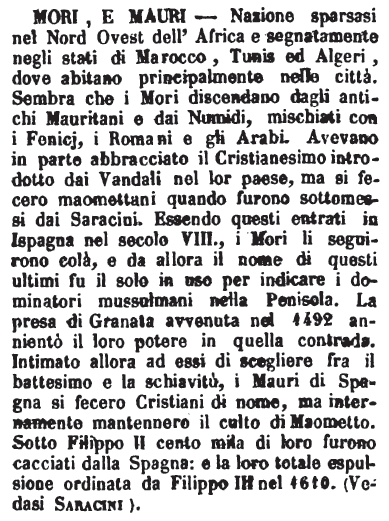 | Mori, e mauri - Nazione sparsasi nel Nord Ovest dell'Africa e segnatamente negli stati di Marocco, Tunis ed Algeri, dove abitano principalmente nelle città. Sembra che i Mori discendano dagli antichi Mauritani e dai Numidi, mischiati con i Fenicj, i Romani e gli Arabi. Avevano in parte abbracciato il Cristianesimo introdotto dai Vandali nel lor paese, ma si fecero maomettani quando furono sottomessi dai Saracini. Essendo questi entrati in Ispagna nel secolo VIII., i Mori li seguirono colà, e da allora il nome di questi ultimi fu il solo in uso per indicare i dominatori mussulmani nella Penisola. La presa di Granata avvenuta nel 1492 annientò il loro potere in quella contrada. Intimato allora ad essi di scegliere fra il battesimo e la schiavitù, i Mauri di Spagna si fecero Cristiani di nome, ma internamente mantennero il culto di Maometto. Sotto Filippo II cento mila di loro furono cacciati dalla Spagna: e la loro totale espulsione ordinata da Filippo III nel 1610. (Vedasi Saracini). [immagine] |
