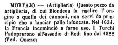 | Mortajo (Artiglieria) - Questo pezzo da artiglieria, di cui Blondeau fa risalire l'origine a quella dei cannoni, non servì da principio che a lanciar palle infuocate. Nel 1634. la Francia incominciò a farne uso. I Turchi l'adoprarono all'assedio di Rodi fino dal 1522 (Ved. Obizzo) [immagine] |
