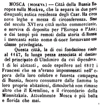 | Mosca (Moskva) - Città della Russia Europea sulla Moskva, che la separa in due parti disuguali; antica residenza degli Czar. Ha circa nove leghe e mezza di circonferenza. Sino dal secolo XVI era città molto commerciante, e serviva di deposito per l'Europa e l'Asia; e dai tempi più remoti della storia di Russia i mercanti sotto nome di gost formavano una classe privilegiata.