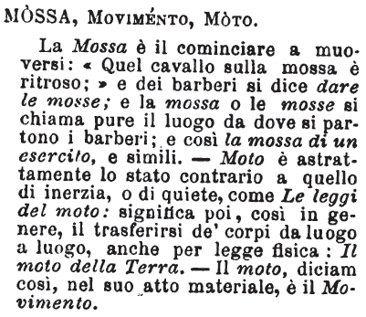 | Mossa, Movimento, Moto - La Mossa è il cominciare a muoversi: « Quel cavallo sulla mossa è ritroso; » e dei barberi si dice dare le mosse; e la mossa o le mosse si chiama pure il luogo da dove si partono i barberi; e così la mossa di un esercito, e simili. - Moto è astrattamente lo stato contrario a quello di inerzia, o di quiete, come Le leggi del moto: significa poi, così in genere, il trasferirsi de' corpi da luogo a luogo, anche per legge fisica: Il moto della Terra. - Il moto, diciam così, nel suo atto materiale, è il Movimento. [immagine] |