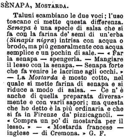 | Senapa, Mostarda - Taluni scambiano le due voci; l'uso toscano ci mette questa differenza. Senapa è una specie di salsa che si fa con la farina de' semi di un'erba (Sinapis nigra) intrisa con acqua o brodo, ma più generalmente con acqua semplice e un pochin di sale. - «Far la senapa - spengerla. - Mangiare il lesso con la senapa. - Senapa forte che fa venire le lacrime agli occhi.» - La Mostarda è mosto cotto, nel quale si mette farina di senapa e si riduce a modo di salsa. - Ce n'è anche di quella preparata diversamente e con varii sapori; ma questa che ho detto è la più ordinaria e che si fa in Firenze da' pizzicagnoli. - «Compra un po' di mostarda per il lesso.» - «Mostarda francese - inglese - di Cremona.» G.F. [immagine] |