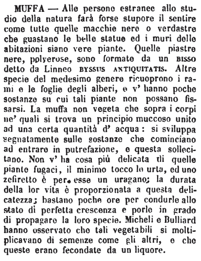 | Muffa - Alle persone estranee allo studio della natura farà forse stupore il sentire come tutte quelle macchie nere o verdastre che guastano le belle statue ed i muri delle abitazioni siano vere piante. Quelle piastre nere, polverose, sono formate da un bisso detto da Linneo byssus antiquitatis. Altre specie del medesimo genere ricuoprono i rami e le foglie degli alberi, e v'hanno poche sostanze su cui tali piante non possano fissarsi. La muffa non vegeta che sopra i corpi ne' quali si trova un principio muccoso unito ad una certa quantità d'acqua: si sviluppa segnatamente sulle sostanze che cominciano ad entrare in putrefazione, e questa sollecitano. Non v'ha cosa più delicata di quelle piante fugaci, il minimo tocco le urta, ed uno zefiretto è per esse un uragano; la durata della lor vita è proporzionata a questa delicatezza; bastano poche ore per condurle allo stato di perfetta crescenza e porle in grado di propagare la loro specie. Micheli e Bulliard hanno osservato che tali vegetabili si moltiplicavano di semenze come gli altri, e che queste erano fecondate da un liquore. [immagine] |