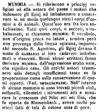 | Mummia - S. f. Cadavere umano che ha la carne appiccata sulle ossa, seccatavi sopra da balsami, bitumí e aromi. (Fanf.) Arab Mum, Cera. Altri lo reca ad Amomum, altri dal gr. Ἄμμος, quasi Ammonia, dalla rena che prosciuga e conserva. Ricett. Fior. 1. 49. (C) La mummia, che ci si porta con carne, ossa, panni, e bitume, non è veramente la mummia degli Arabi.