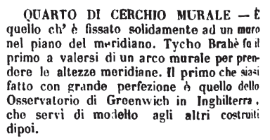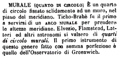 | Murale (Quarto di circolo) - E' un quarto di circolo fissato solidamente ad un muro, nel piano del meridiano. Ticho-Brahè fu il primo a servirsi di un arco murale per prendere le altezze meridiane. Elvezio, Flamstead, Latteri ed altri astronomi si valsero di quarti di circolo murali. Il primo istrumento di questo genere fatto con somma perfezione è quello dell'Osservatorio di Greenwich. [immagine] |