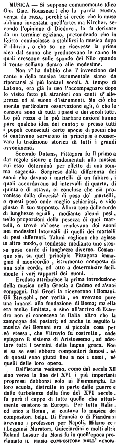 Non v'ha dubbio che l'invenzione del canto e della musica istrumentale siano da riportarsi ai più lontani secoli. A tempo di Labano, era già in uso l'accompagnare dopo le visite fatte gli stranieri con canti d'allegrezza ed al suono d'istrumenti. Ma ciò che merita particolare osservazione egli, è che le canzoni sono di tutti i paesi e dei secoli tutti. Le più rozze e le più barbare nazioni hanno pure qualche idea del canto; e presso tutti i popoli conosciuti certe specie di poemi che si cantavano servirono in principio a conservare la tradizione storica di tutti i grandi avvenimenti. Secondo Dutens, Pittagora fu il primo a dar regole sicure e fondamentali alla musica cui esso determinò per effetto di una somma sagacità. Sorpreso dalla differenza dei suoni che davano i martelli di un fabbro, i quali accordavano ad intervalli di quarta, di quinta e di ottava, ei concluse che ciò provenisse dalla diversità di peso de' martelli, e questi pesò onde meglio schiarirsi, e vide giusto il suo supposto. Allora tese delle corde di lunghezze eguali, mediante alcuni pesi, nelle proporzioni della pesezza di quei martelli, e trovò ch'esse rendevano dei suoni nei medesimi intervalli di quelli dei martelli di pesi differenti. Taluni vogliono che agisse in altro modo, e tendesse mediante uno stesso peso corde di lunghezze diverse. Comunque sia, su quel principio Pittagora immaginò il monicordio, istrumento composto di una sola corda, ed atto a determinare facilmente i varj rapporti dei suoni. Erodoto attribuisce la prima introduzione della musica nella Grecia a Cadmo ed a' suoi compagni. Dai Greci la riceverono i Romani. Gli Etruschi, per verità, ne avevano pure una innanzi alla fondazione di Roma; ma ella era molto limitata, e sino all'arrivo di Evandro non si conosceva in Italia altro che la zampogna dei pastori; ed anche in seguito la musica dei Romani era si piccola cosa per sè stessa, che Vitruvio fu costretto, onde spiegare il sistema di Aristossemo, ad adottare tutti i termini della lingua greca. Non si sa se essi ebbero compositori famosi, nè di questi sono giunti fino a noi i nomi, nè quelli delle loro opere. Dall'istoria vediamo, come dal secolo XII sino verso la fine del XVI i più importanti progressi debbonsi solo ai Fiamminghi. La loro scuola, distrutta in parte dalle guerre e dalle trubolenze della fine del XVI secolo, fu però il ceppo di tutte quelle che attualmente esistono in Europa. Per tutta Italia, ed anco a Roma, si cantava la musica dei compositori belgi. Di Francia e di Fiandra si avevano i professori per Napoli, Milano ec: (Leggansi Muratori, Guicciardini e molti altri) Roland Lassur da Mons fu in quell'epoca proclamato il primo compositore dell'Europa. [immagine] |