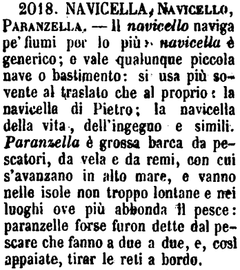 | Navicella, Navicello, Paranzella - Il navicello naviga pe' fiumi per lo più: navicella è generico; e vale qualunque piccola nave o bastimento: si usa più sovente al traslato che al proprio: la navicella di Pietro; la navicella della vita, dell'ingegno e simili. Paranzella è grossa barca da pescatori, da vela e da remi, con cui s'avanzano in alto mare, e vanno nelle isole non troppo lontane e nei luoghi ove più abbonda il pesce: paranzelle forse furon dette dal pescare che fanno a due a due, e, così appaiate, tirar le reti a bordo. [immagine] |