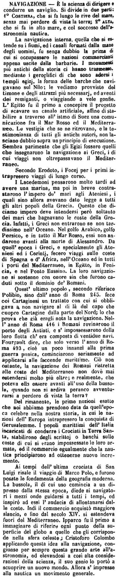 | Navigazione - E' la scienza di dirigere e condurre un naviglio. Si divide in due parti: 1° Costiera, che si fa lungo le rive del mare, senza mai perdere di vista la terra; 2° alta, che si fa in alto mare, e col soccosso dell'astronomia nautica.
