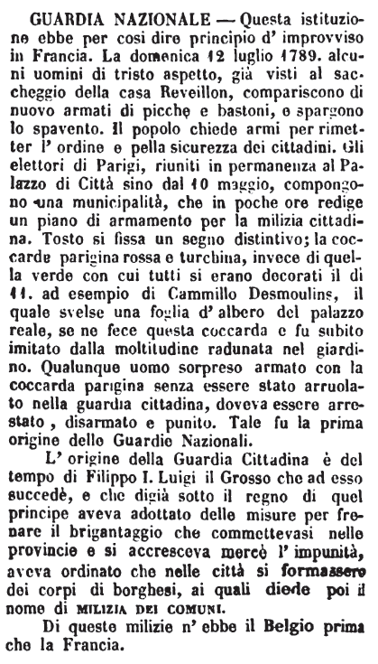 | Guardia nazionale - Questa istituzione ebbe per così dire principio d'improvviso in Francia. La domenica 12 luglio 1789. alcuni uomini di tristo aspetto, già visti al saccheggio della casa Reveillon, compariscono di nuovo armati di picche e bastoni, e spargono lo spavento. Il popolo chiede armi per rimetter l'ordine e pella sicurezza dei cittadini. Gli elettori di Parigi, riuniti in permanenza al Palazzo di Città sino dal 10 maggio, compongono una municipalità, che in poche ore redige un piano di armamento per la milizia cittadina. Tosto si fissa un segno distintivo; la coccarda parigina rossa e turchina, invece di quella verde con cui tutti si erano decorati il dì 11. ad esempio di Camillo Desmoulins, il quale svelse una foglia d'albero del palazzo reale, se ne fece questa coccarda e fu subito imitato dalla moltitudine radunata nel giardino. Qualunque uomo sorpreso armato con la coccarda parigina senza essere stato arruolato nella guardia cittadina, doveva essere arrestato, disarmato e punito. Tale fu la prima origine delle Guardie Nazionali.