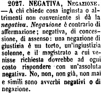 | Negativa, Negazione - A chi chiede cosa ingiusta o altrimenti non conveniente si dà la negativa. Negazione è contrario di affremazione; negativa, di concessione, di assenso: una negazione di giustizia è un torto, un'ingiustizia solenne, e il magistrato a cui venisse richiesta dovrebbe ad ogni costo rispondere con un'assoluta negativa. No, non, non già, non mai e simili sono avverbi negativi o di negazione. [immagine] |