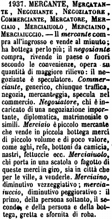 | Mercante, Mercatante, Negoziante, Negoziatore, Commerciante, Mercatore, Merciaio, Merciaiuolo, Merciaino, Merciaiuccio - Il mercante compra all'ingrosso e vende al minuto; ha bottega per lo più; il negoziante compra, rivende in paese o fuori secondo le convenienze, opera su quantità di maggiore rilievo: il negoziante è speculatore. Commerciante, generico, chiunque traffica, negozia, mercanteggia, specula nel commercio. Negoziatore, chi è incaricato di una negoziazione importante, diplomatica, matrimoniale o simili. Merciaio è piccolo mercante che vende in piccola bottega merci di piccolo volume e di poco valore, come aghi, refe, bottoni da camicia, nastri, fettuccie ecc. Merciaiuolo, chi porta in una scatola o fagotto di queste merci in giro, sia in città che per le ville, a venderle. Merciaino, diminutivo vezzeggiativo; merciaiuccio, diminutivo peggiorativo: il primo, della persona soltanto, il secondo, e della persona e della bottega, gretta e sfornita di roba. [immagine] |