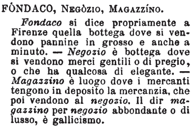 | Fondaco, Negozio, Magazzino - Fondaco si dice propriamente a Firenze quella bottega dove si vendono pannine in grosso e anche a minuto. - Negozio è bottega dove si vendono merci gentili o di pregio, o che ha qualcosa di elegante. - Magazzino è luogo dove i mercanti tengono in deposito la mercanzia, che poi vendono al negozio. Il dir magazzino per negozio abbondante o di lusso, è gallicismo. [immagine] |